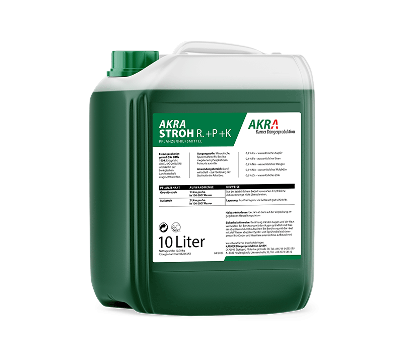 AKRA Stroh R. + P + K is a soil additive that results in a faster rotting of crop residues (for spraying on straw after harvesting, to encourage straw rotting on arable land). With AKRA Stroh R. + P + K, the organic molecules in crop residues (cellulose and lignin) are broken down. As such, no additional nitrogen is necessary.